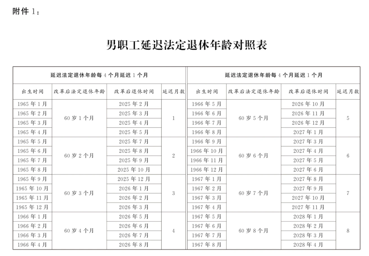 1.男職工延遲法定退休年齡對照表