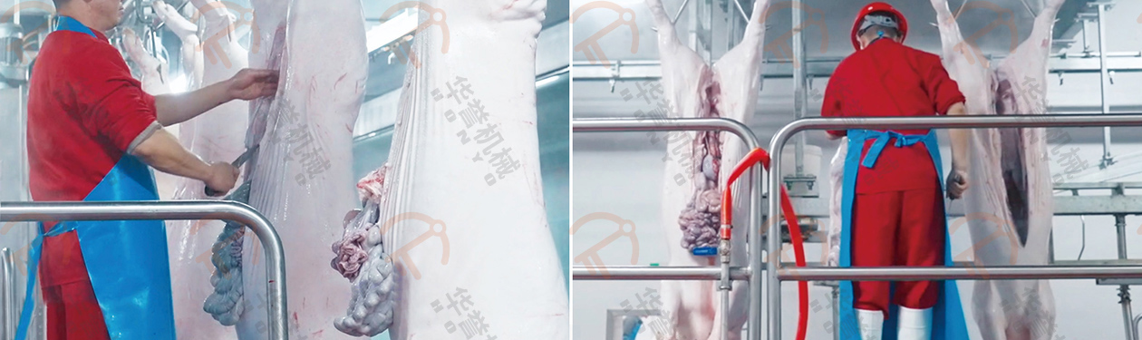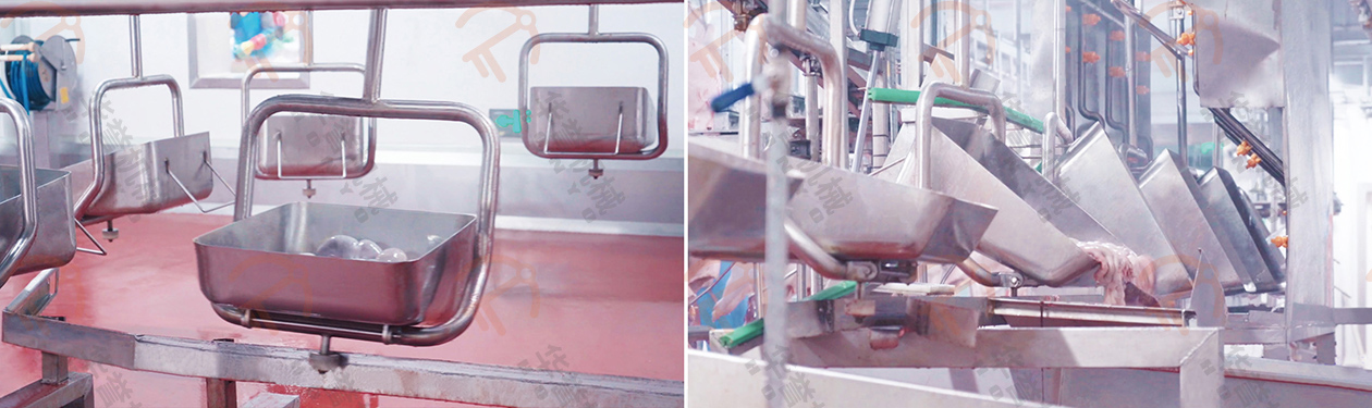 取下后的白臟放入白臟盤內,紅臟掛到紅臟鉤上,經(jīng)衛(wèi)生檢疫沒問題后,通過輸送線送入紅白臟處理間。(白臟:胃、腸等部分;紅臟:心、肝、肺等紅色內臟部分)
