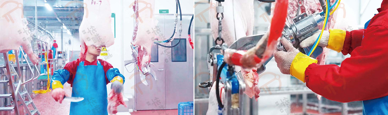劈半后的豬胴體輸送到人工精修區(qū),在這里進行修割胴體和去除前蹄的操作。剪蹄鉗主要用于動物的蹄部處理,采用液壓式設計,操作簡單,效率更高。