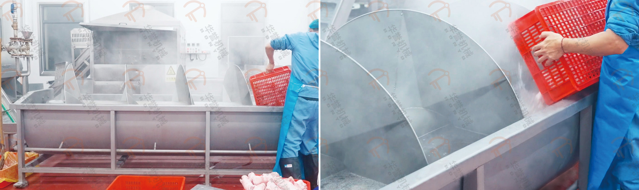 瀝血后的毛豬通過瀝血輸送線運送到運河式燙毛池前,通過下降機將毛豬浸在池內進行燙毛。運河式燙毛池可實現(xiàn)人工或PLC遠程控制操作,實現(xiàn)精準控溫,更具有使用成本低、燙毛均勻、循環(huán)水方向與豬體輸送方向相反等優(yōu)勢。